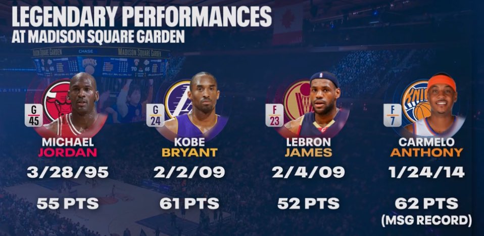 世界最中心!麦迪逊广场最高分:甜瓜62一枝独秀 科比61乔詹随后
